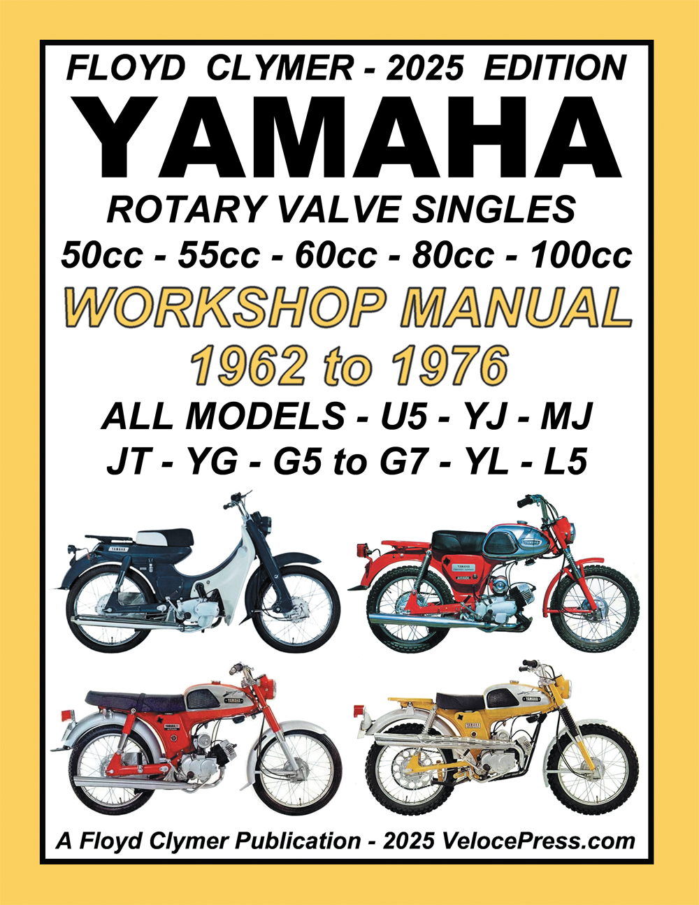 142 pages and profusely illustrated with more than 300 illustrations, diagrams and charts, size 8.250 x 10.750 inches. Originally published by Floyd Clymer in 1969, this manual has been updated to include Yamaha Step-thru, Road and Enduro Rotary Valve single cylinder models through 1976.