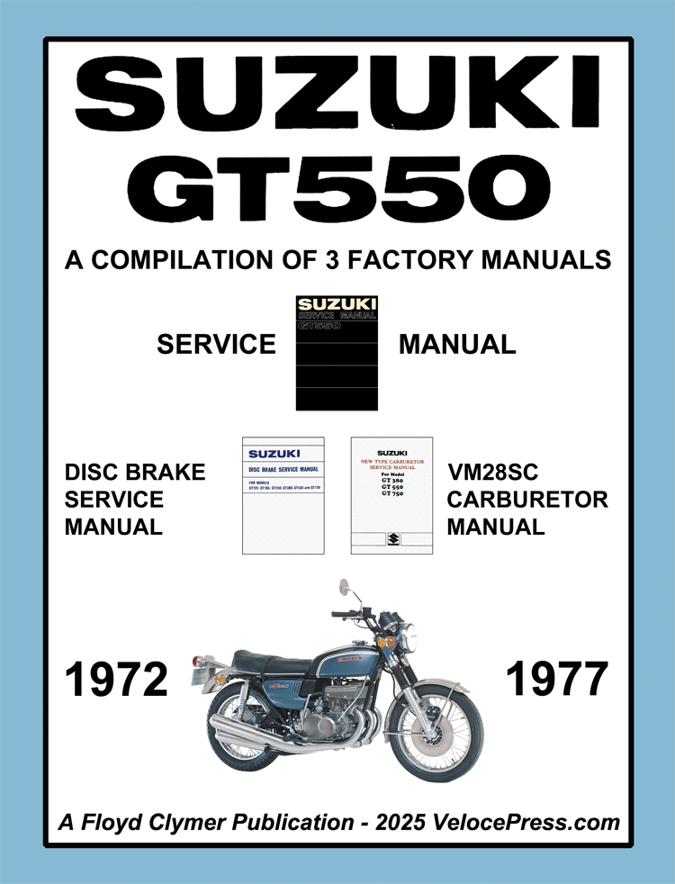 1) GT550 Service Manual More appropriately a 'Workshop Manual' as it includes comprehensive specifications and general data information and covers the disassembly, reassembly, overhaul and maintenance of the major mechanical items including the engine, clutch, transmission, lubricating system, carburetor and fuel system and engine electrical system and wiring diagrams, suspension, wheels, drive chain and tires. It also includes a section on trouble-shooting and special tools. (82 pages, 2nd Edition, published June 1975).