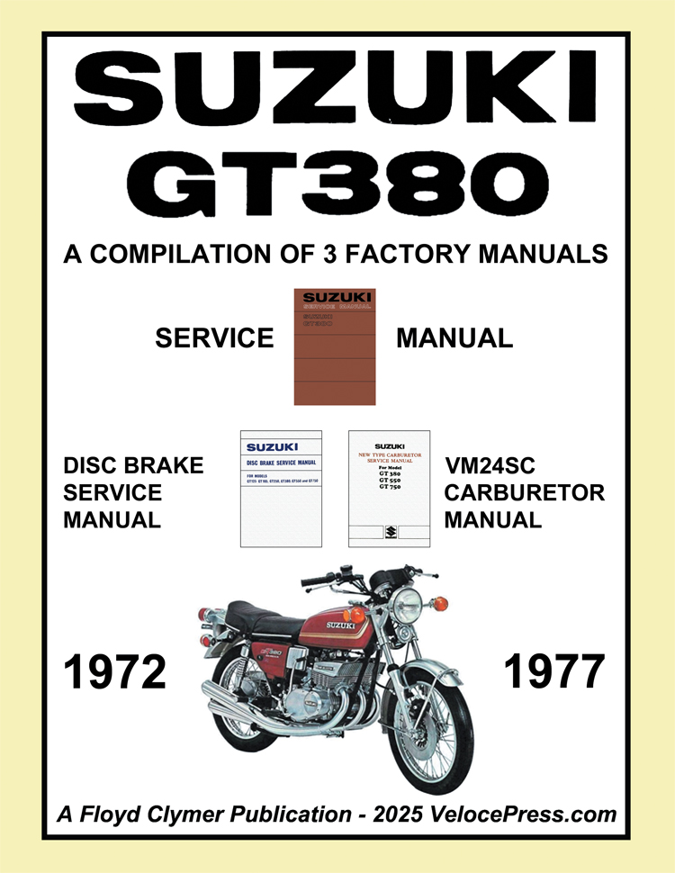 1) GT380 Service Manual More appropriately a Workshop Manual as it includes comprehensive specifications and general data information and covers the disassembly, reassembly, overhaul and maintenance of the major mechanical items including the engine, clutch, transmission, lubricating system, carburetor and fuel system and engine electrical system and wiring diagram, suspension, wheels, drive chain and tires. It also includes a section on trouble-shooting and special tools. (54 pages, published January 1978).