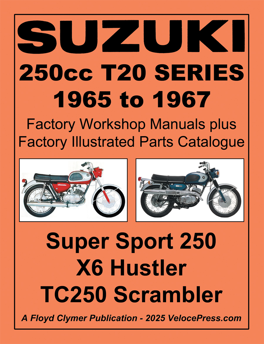 216 pages and profusely illustrated with more than 220 illustrations, diagrams and charts, size 8.250 x 10.750 inches. This manual covers the 1965 to 1967 250cc T20 twin-cylinder two-stroke series. A compilation of three factory publications it includes (1) the factory T20 and the 250 Super Sport Service Guide and (2) the T20/TC250 Parts Catalogue and (3) the T200 Service Guide for the reason explained below.